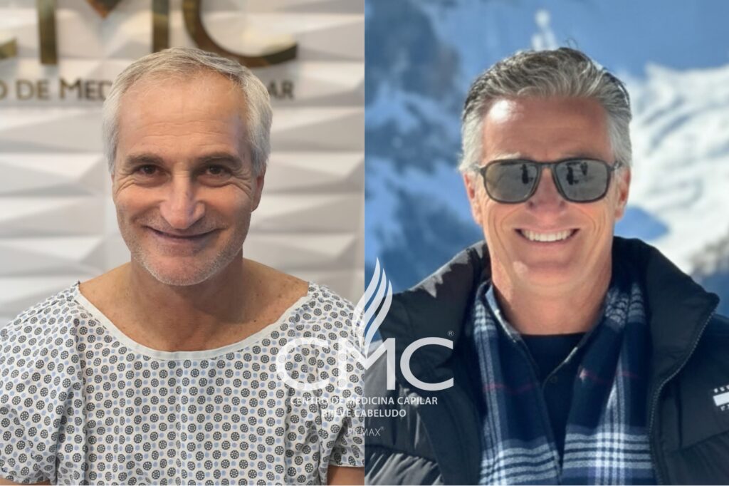 Por se tratar de cabelos do próprio paciente, a harmonia entre fios brancos e escuros se mantém. Mesmo quando há uma quantidade maior de fios brancos na hairline, é possível construir uma linha frontal extremamente natural e sofisticada, respeitando o padrão do cabelo existente.
